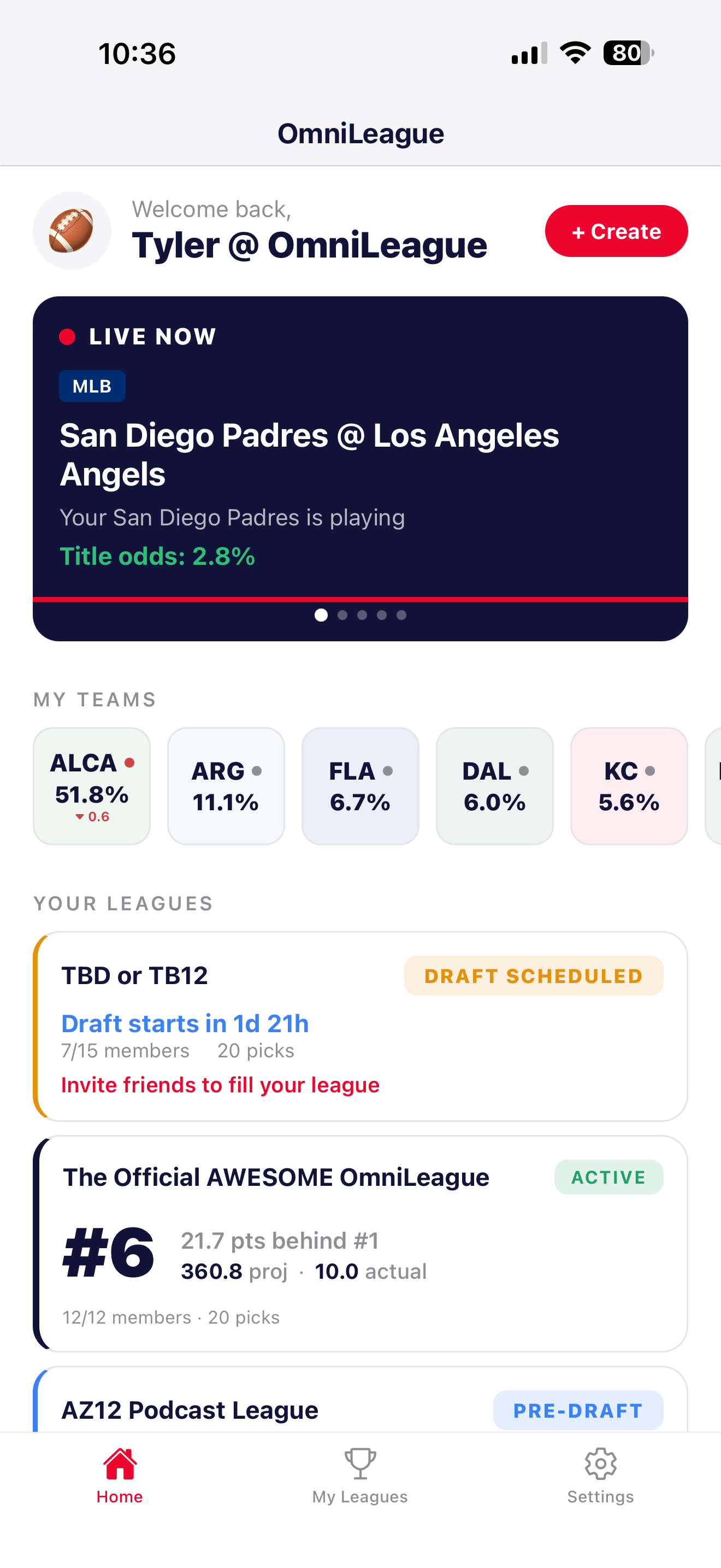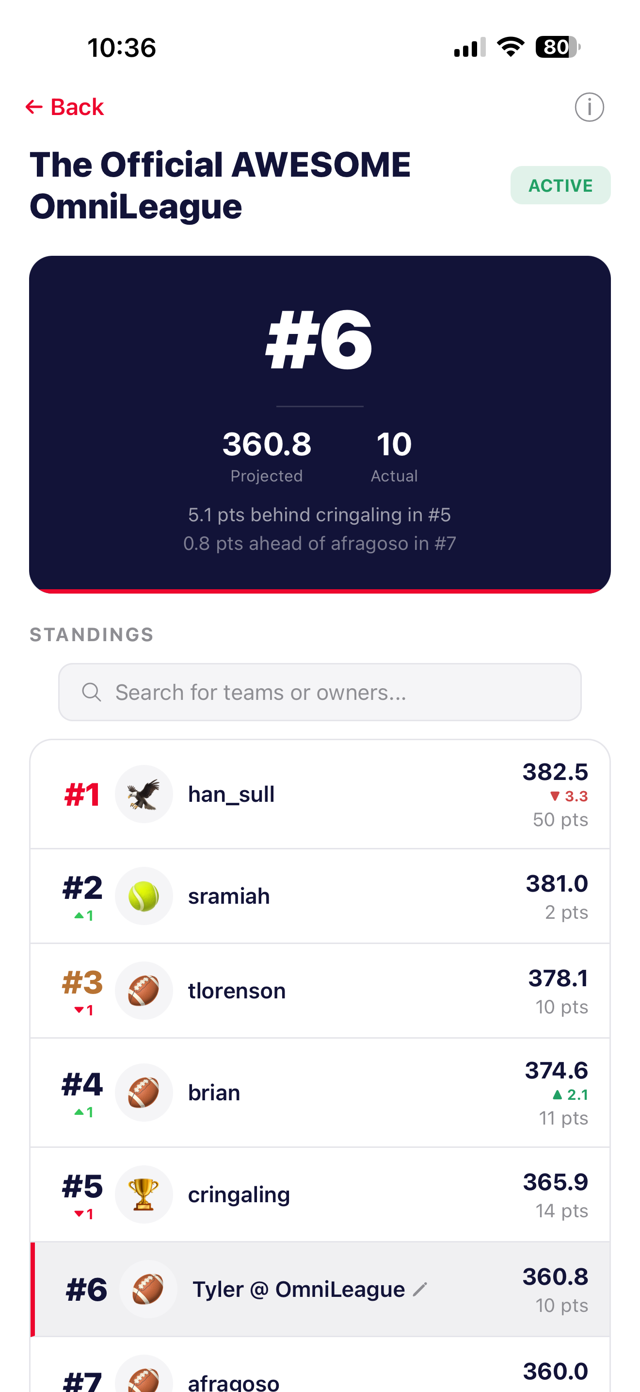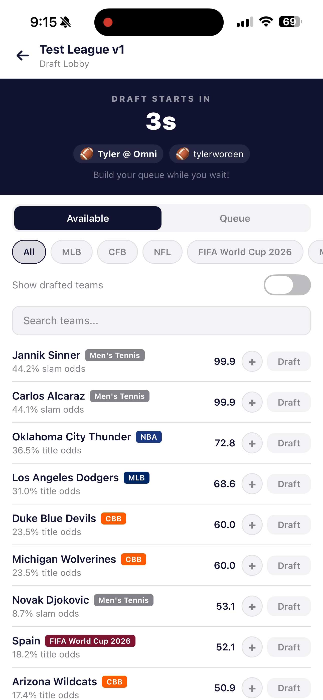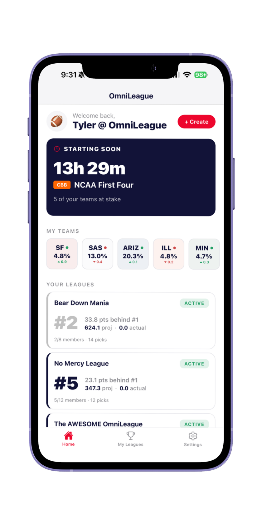 OmniLeague pulls live championship odds straight from prediction markets, updated continuously. Your standings reflect what the world actually thinks is going to happen.